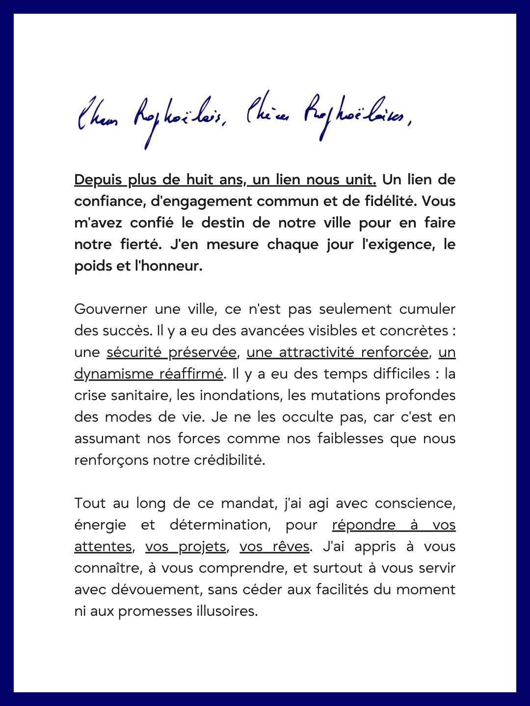 Depuis plus de huit ans, un lien nous unit. Un lien de confiance, d'engagement commun et de fidélité. Vous m'avez confié le destin de notre ville pour en faire notre fierté. J'en mesure chaque jour l'exigence, le poids et l'honneur. Gouverner une ville, ce n'est pas seulement cumuler des succès. Il у a eu des avancées visibles et concrètes : une sécurité préservée,une attractivité renforcée, un dynamisme réaffirmé. Il y a eu des temps difficiles : la crise sanitaire, les inondations, les mutations profondes des modes de vie. Je ne les occulte pas, car c'est en assumant nos forces comme nos faiblesses que nous renforçons notre crédibilité. Tout au long de ce mandat, j'ai agi avec conscience, énergie et détermination, pour répondre à vos attentes, vos projets, vos rêves. J'ai appris à vous connaître, à vous comprendre, et surtout à vous servir avec dévouement, sans céder aux facilités du moment ni aux promesses illusoires. Aujourd'hui, je ne viens pas dresser un inventaire, ni promettre l'impossible. Je viens vous proposer de poursuivre ensemble le chemin que nous avons commencé : un chemin d'exigence, de sérieux et de devoir. L'ambition reste simple : réussir dans la continuité pour notre avenir, celui de nos familles, de nos enfants et de ceux qui viendront après nous. À l'heure où tant de certitudes vacillent, je crois à la valeur du temps long, à l'intégrité de notre histoire, au respect de la parole donnée, à une politique ambitieuse qui protège et qui grandit. C'est cette espérance collective que nous pouvons porter ensemble en restant fidèles à ce que nous sommes.